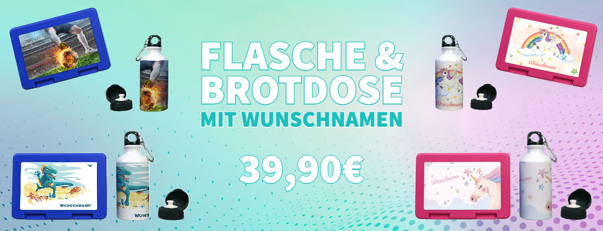 Set - Brotdose und Trinkflache mit Namen und Motiv bedruckt.