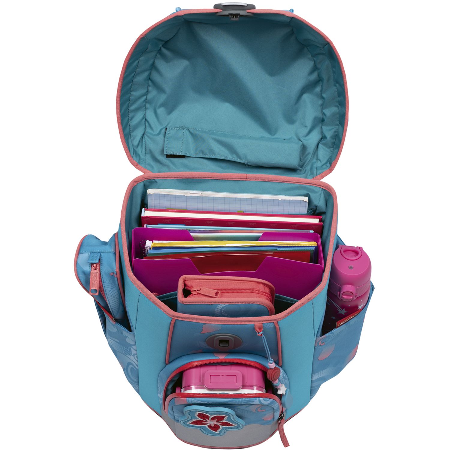 Das Set enthält neben dem Schulranzen noch einen Turnbeutel, ein Schlamperetui, ein bestücktes Federmäppchen mit Staedtler Qualitätsbuntstiften und 2 Funny Snaps Move und 1 Anhänger.