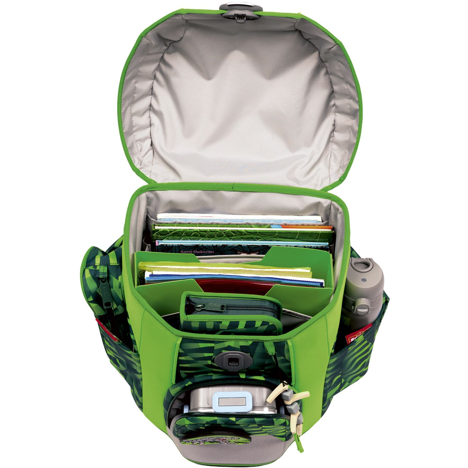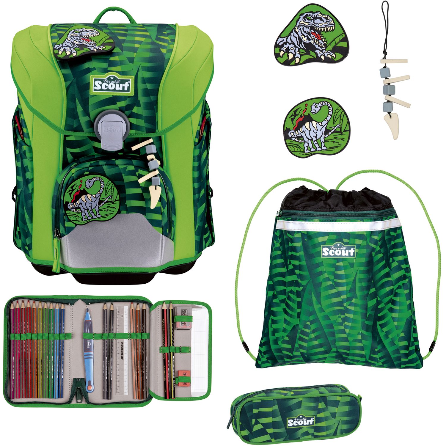 Das Set enthält neben dem Schulranzen noch einen Turnbeutel, ein Schlamperetui, ein bestücktes Federmäppchen mit Staedtler Qualitätsbuntstiften und 2 Funny Snaps Move und 1 Anhänger.